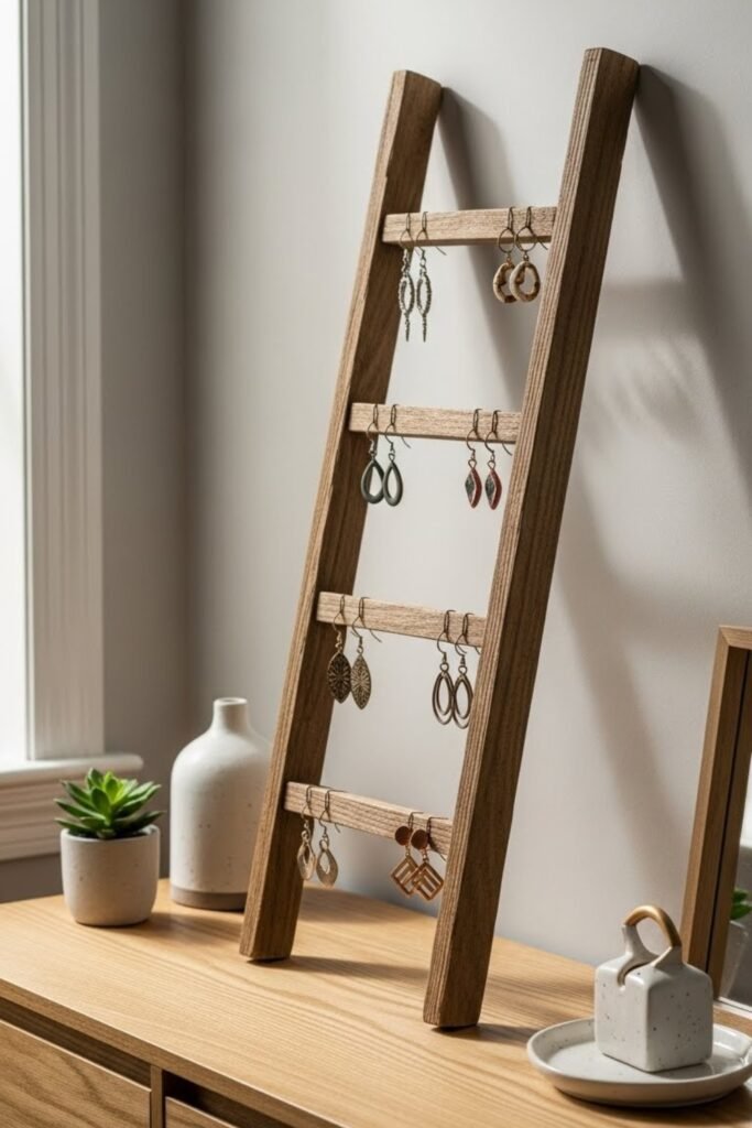 A mini ladder earring holder uses a small wooden ladder leaned against a wall or placed on a dresser. Hang earrings from each rung using hooks or directly over the wood.