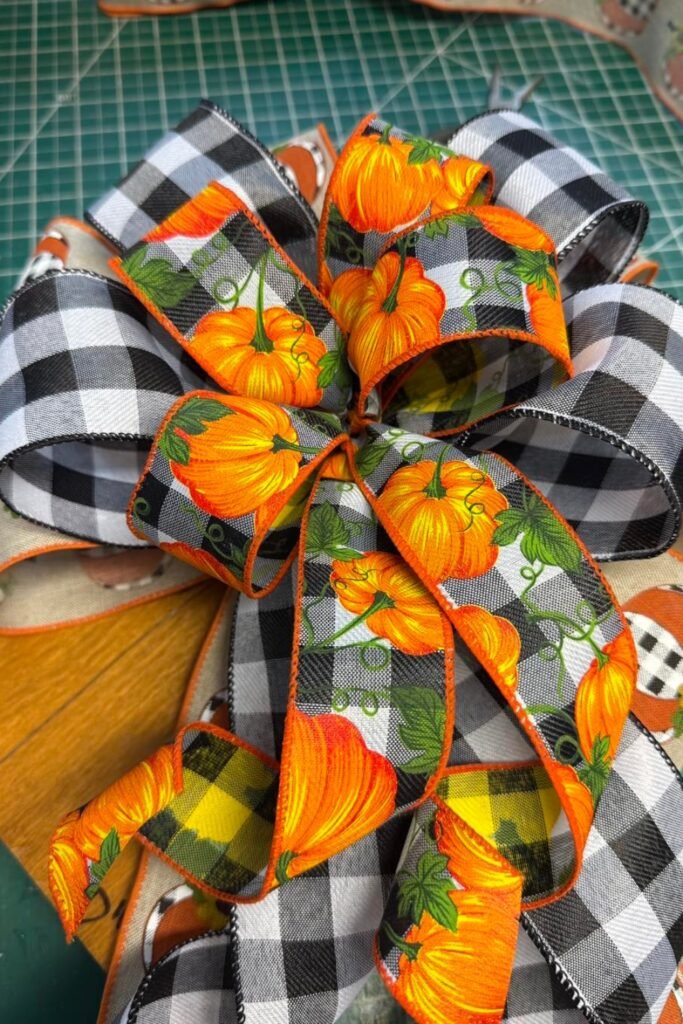 A big bow can make a simple wreath into a spectacular piece for fall. This design puts pumpkin-print ribbon on top of black-and-white buffalo check, which adds contrast and a seasonal touch right away.