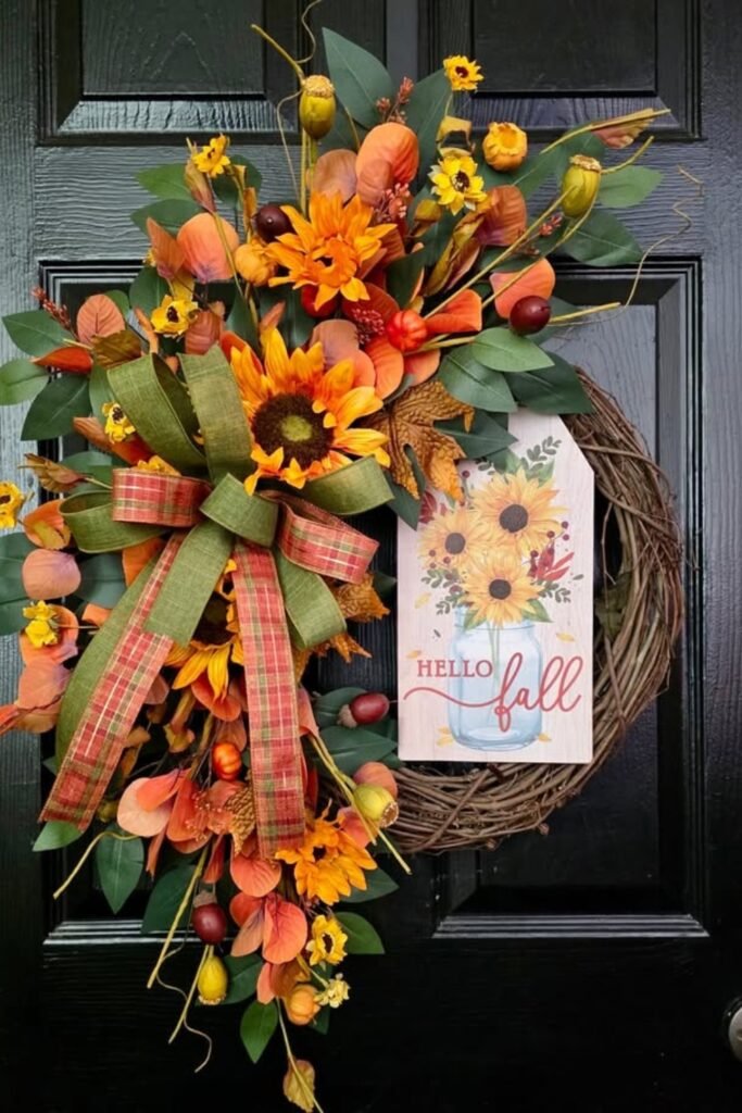 This design has a rustic “Hello Fall” sign and bright sunflowers, which make it both friendly and lovely.