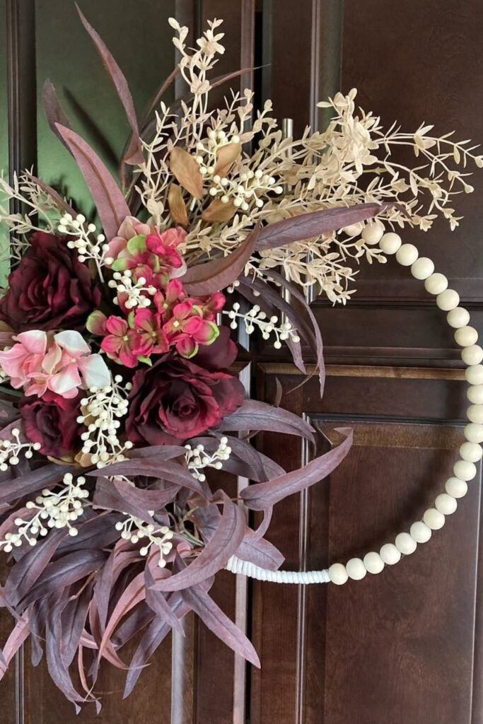To make it again, use a bead hoop frame, floral tape to hold fake roses, hydrangeas, and eucalyptus branches in place, and then add cascading leaves for movement. It fits perfectly with modern homes or accent walls inside.
