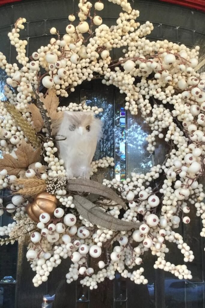 With clusters of white berries, metallic leaves, and a small owl figure in the center, this wreath looks like it’s from a cold fall day.