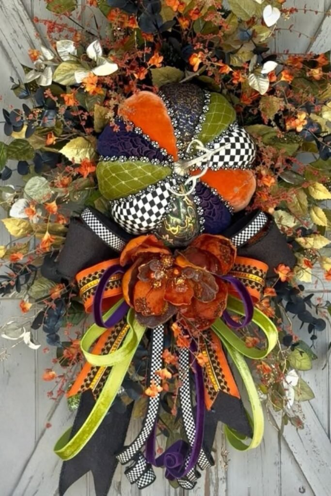 This fun wreath has a big fabric pumpkin in patchwork designs in the middle, with bright green leaves and ribbons in Halloween colors surrounding it.