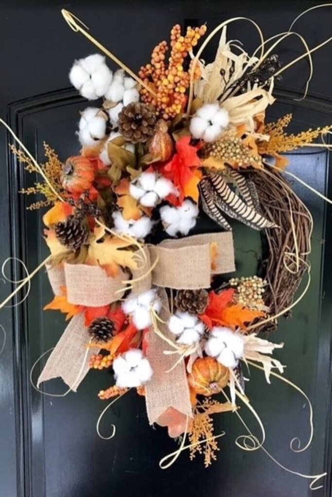 The burlap bow pulls everything together, which makes it a fantastic choice for doors in a farmhouse design. To do this again, put cotton and pinecones on top of each other evenly on a grapevine base.
