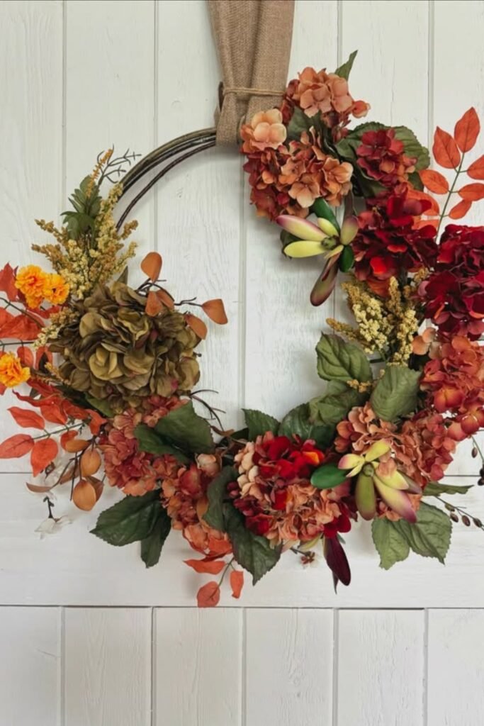 To make a new one, evenly space out the hydrangea heads around a grapevine base, then add fake succulents and golden filler stems for contrast. Using a burlap ribbon to hang it gives it a rustic vibe while still keeping it balanced and lovely.