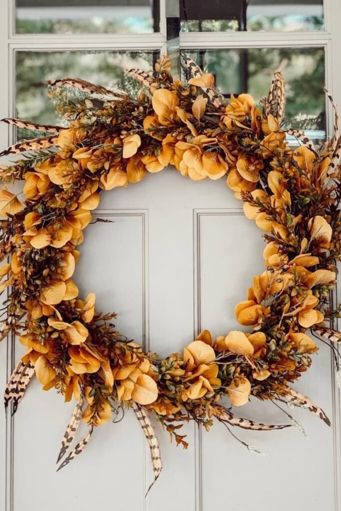 It looks great on doors that are a neutral color because the warm tones stand out. To do this again, stack fake hydrangea leaves around a grapevine foundation and then add feathers at different angles to make them move.
