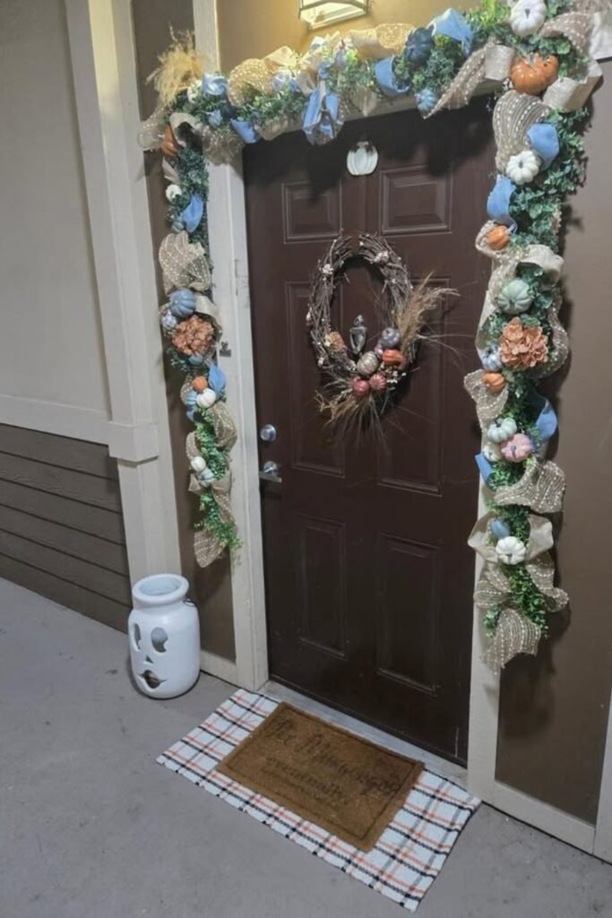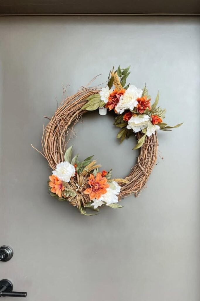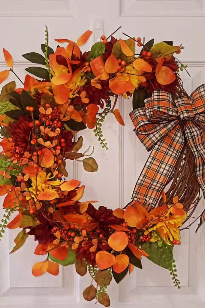For richness, add fake leaves and orange flowers. It’s great for doors that require a fun, festive touch.