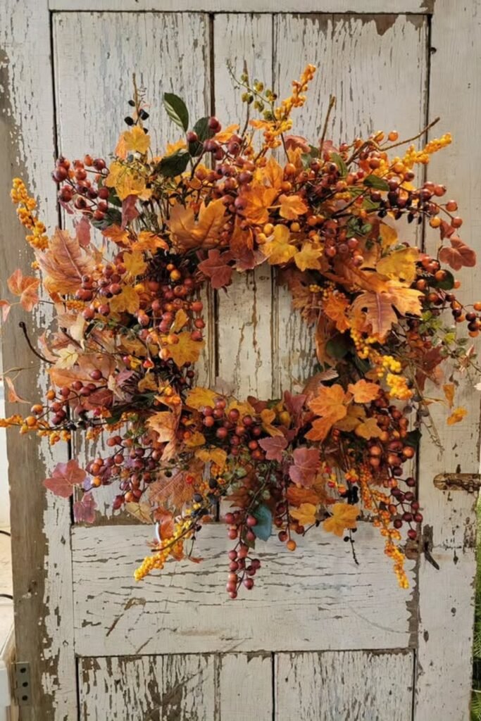 This wreath is full of clusters of berries and stacked maple leaves, which add color and texture to a basic entryway.