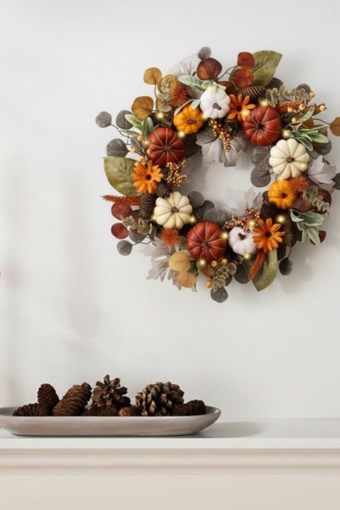 To make a new one, wrap a foam or wire ring in burlap ribbon and pin it down. Then, on one side, put pumpkins and leaves together. It has a basic design that looks well on front doors or even indoors beside a fireplace.