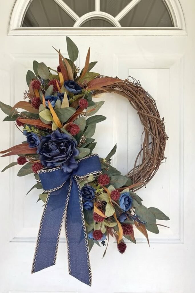 The rich blue flowers and burgundy embellishments on this wreath make it stand out and give fall colors a dramatic twist.