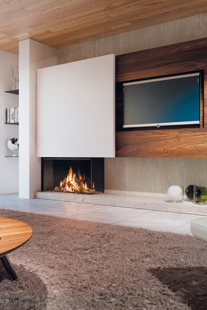 Stone cladding wrapped around the structure creates a strong architectural feature while giving the fireplace and TV a bold, grounded presence naturally.