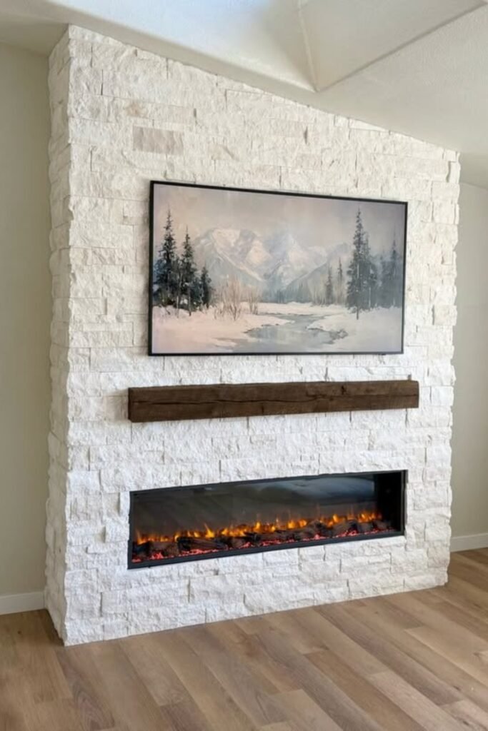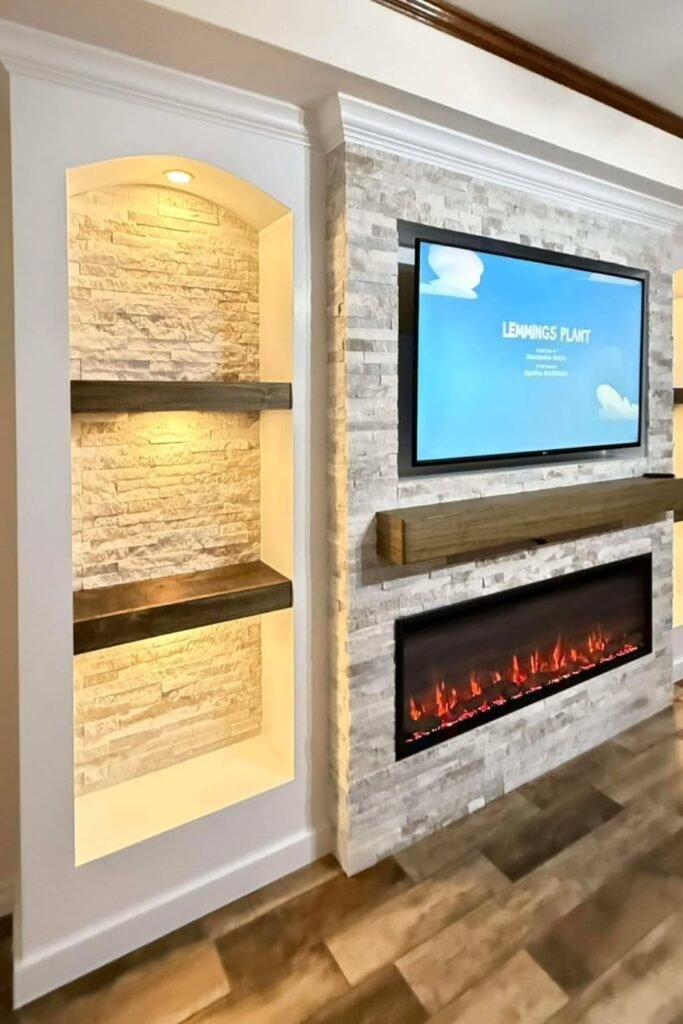 DIY this by stacking lightweight panel stone, then framing a recessed cavity for the electric fireplace and a floating wood mantel.