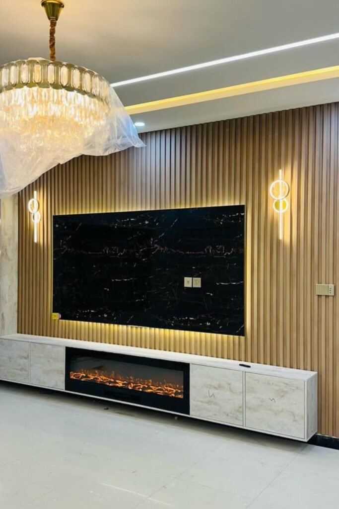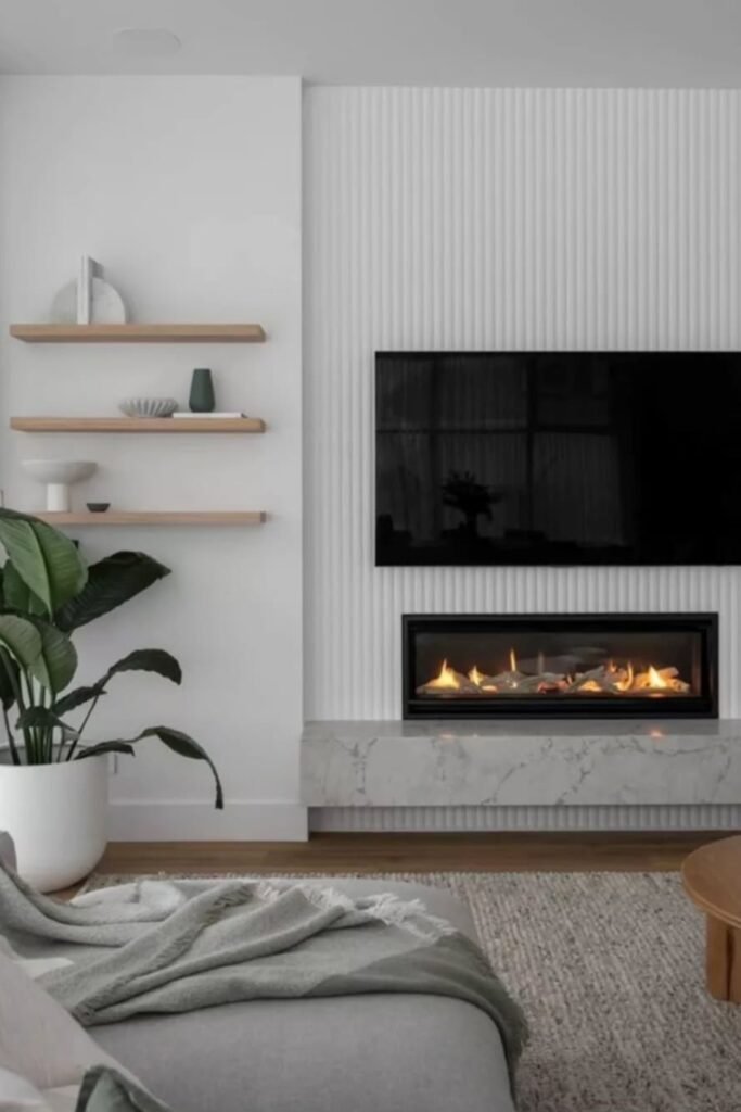 Combining a slatted backdrop with a sleek marble cabinet gives your fireplace TV wall a luxury profile while keeping the design modern and minimal.