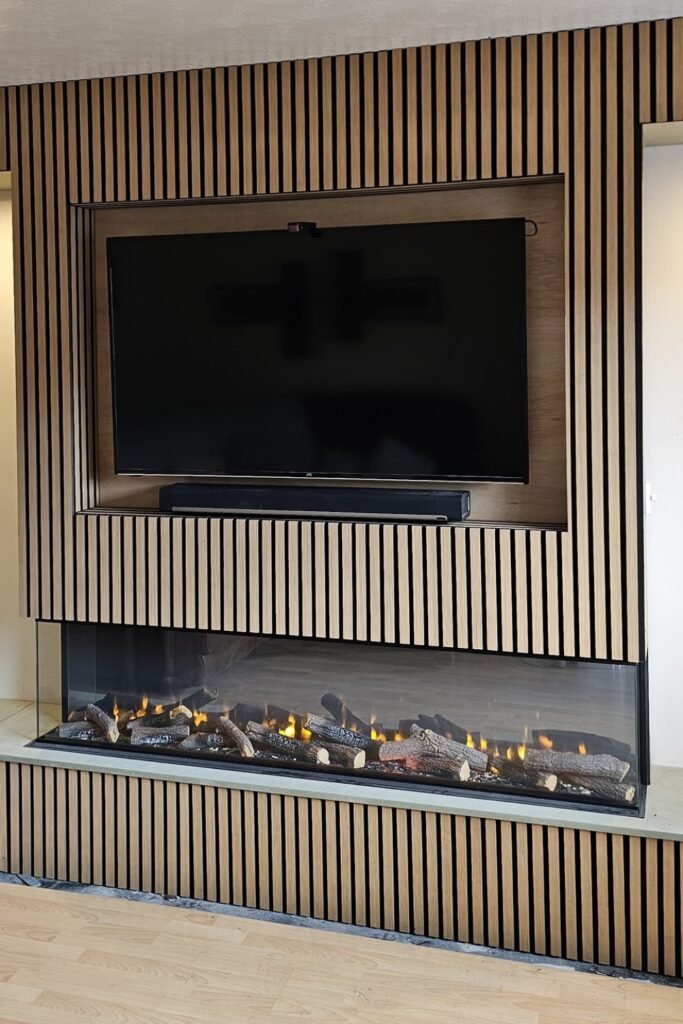 Let vertical slatted panels break up the flat wall so the long electric fireplace feels settled instead of floating without definition or balance.