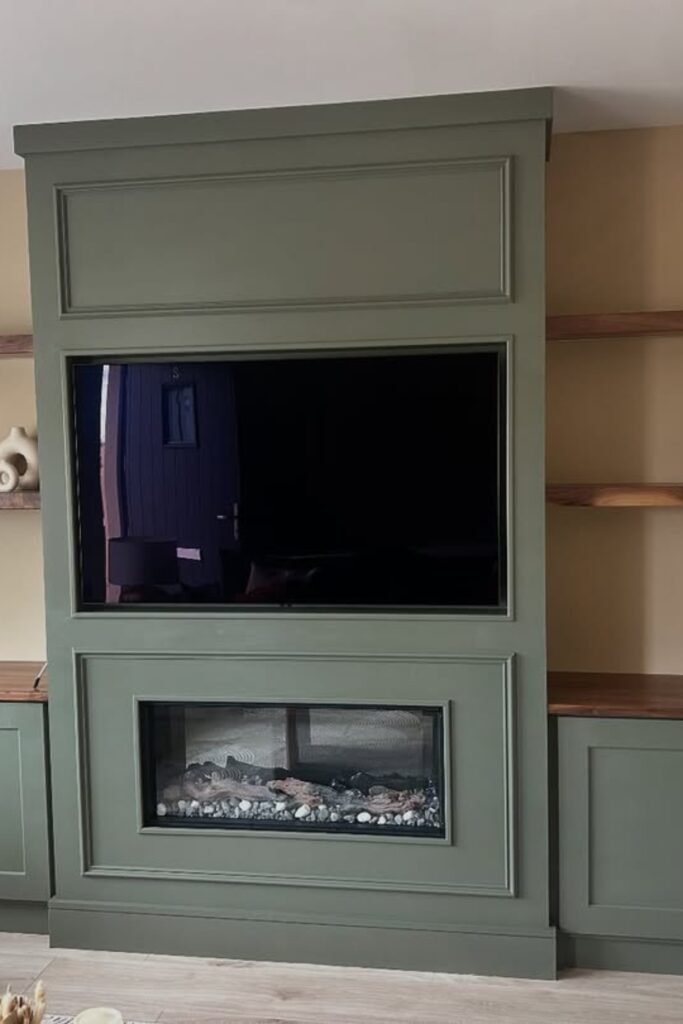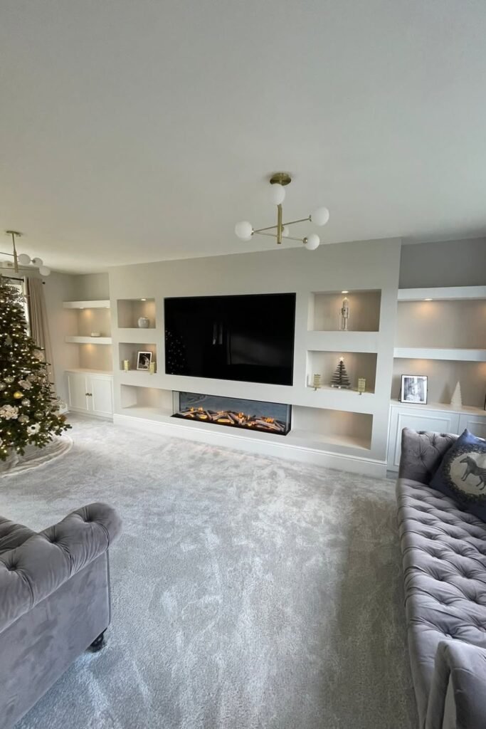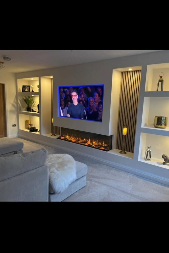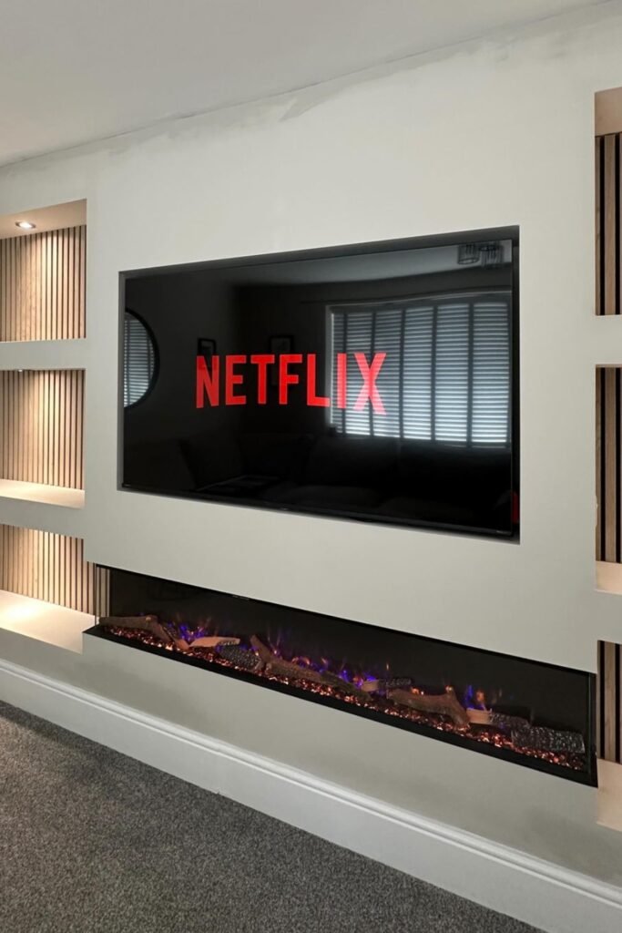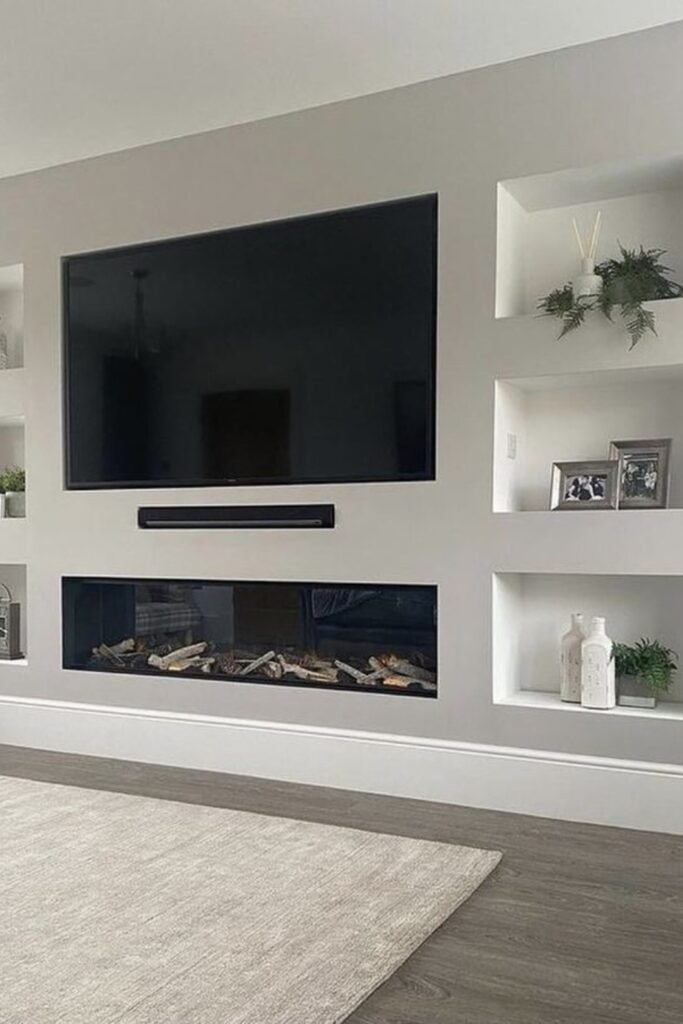 Extending the niches across the full length creates a balanced look while giving your fireplace TV wall strong structure and seamless visual flow.