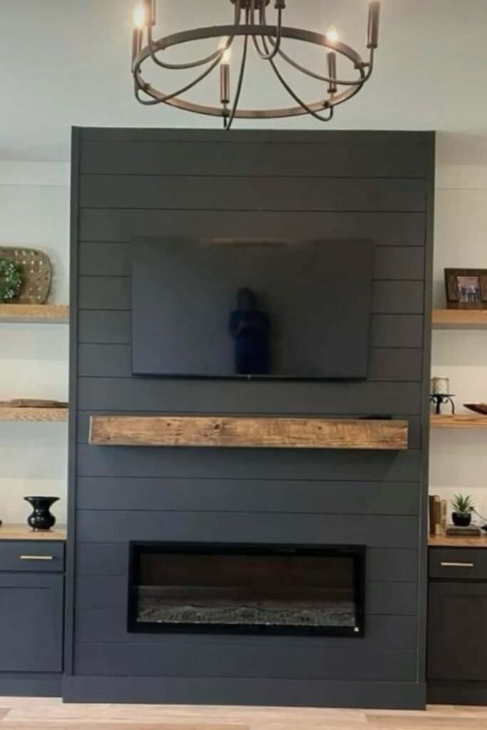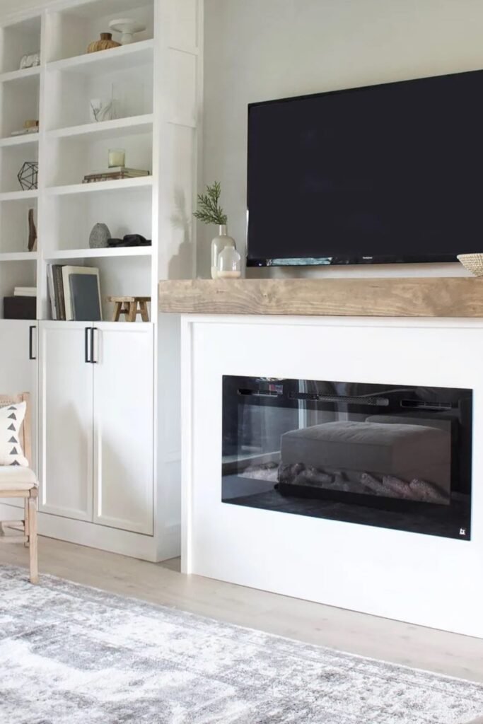 This DIY suits homes wanting a blend of rustic tones and modern structure while letting the electric fireplace glow stand out sharply.