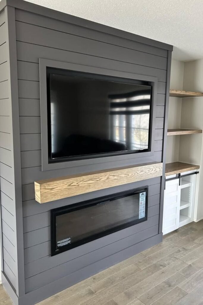 A focused shiplap column pulls the fireplace and TV forward, giving rooms with long walls a strong anchored feature without clutter.