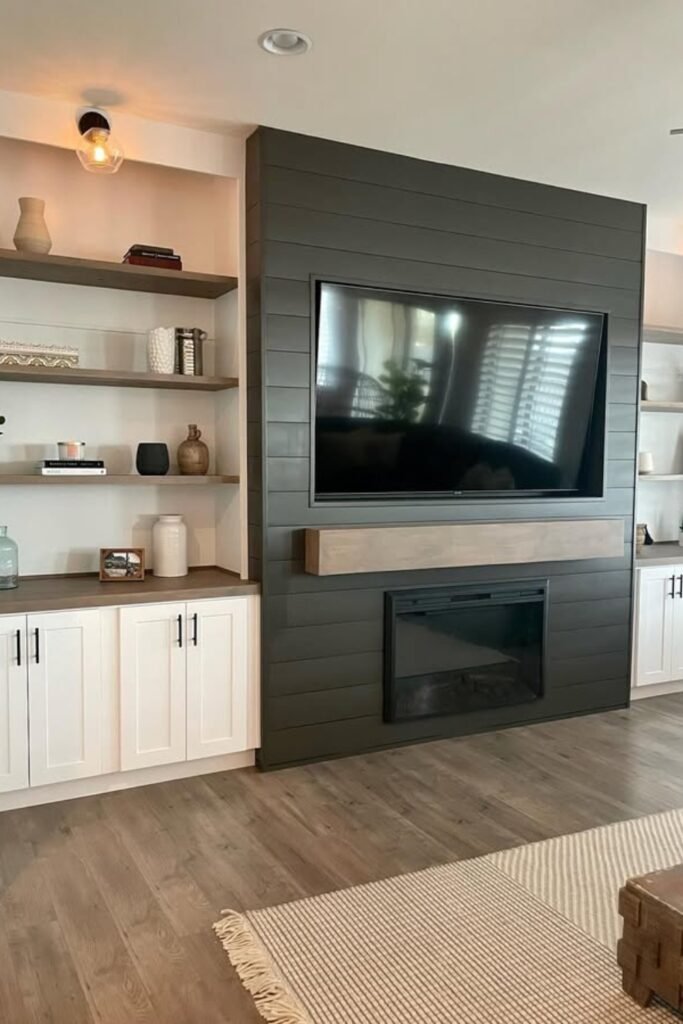 A dark shiplap panel anchors the TV and creates a strong vertical visual line, perfect for open layouts needing definition.