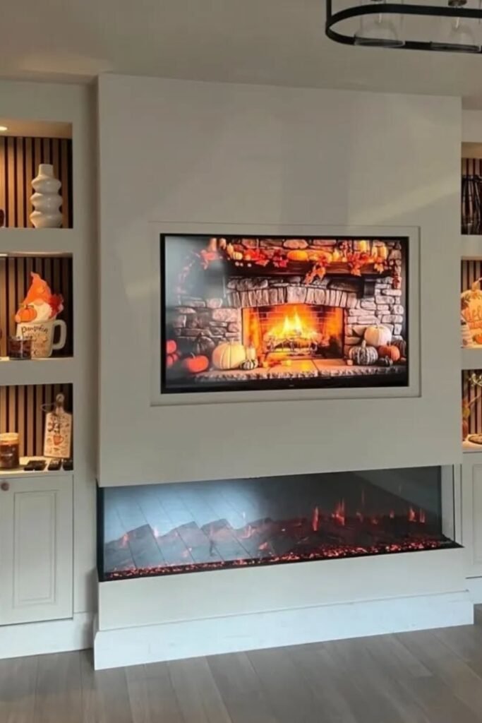 Craft this layout when you want a fireplace TV wall that fills space cleanly while keeping everything symmetrical and visually balanced effortlessly.