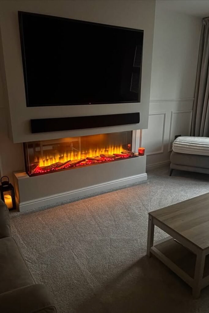 Setting the electric fireplace low to the ground gives the wall a grounded feel and allows the TV to sit comfortably without visual tension.