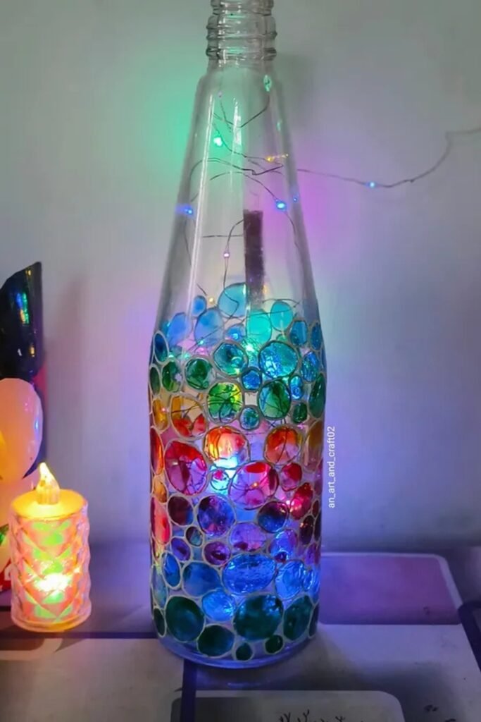 Painted bottles with fairy lights create glowing décor perfect for balconies, patios, or evening gatherings needing soft warm ambient illumination.