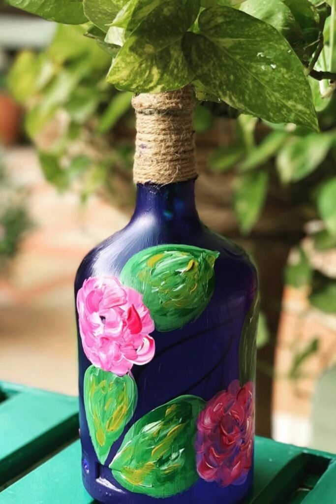 Hand-painted florals on this deep blue bottle create striking décor ideal for patios, plant corners, or bright indoor spaces needing artistic expression.