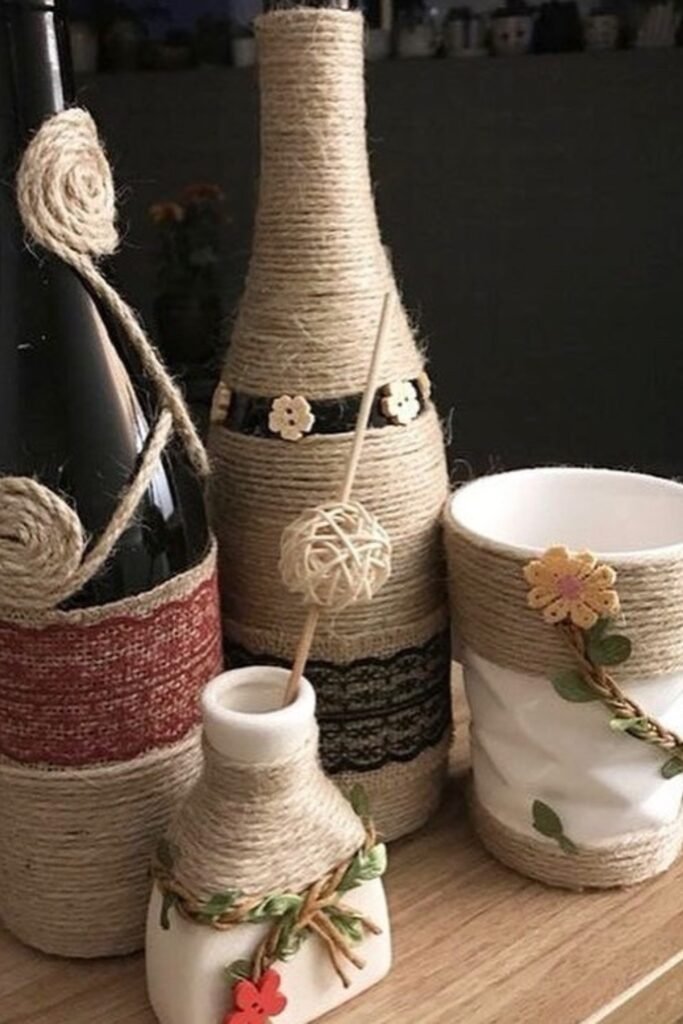 Wrap twine tightly around each bottle, add lace bands or small embellishments, and mix shapes to build coordinated decorative arrangements.