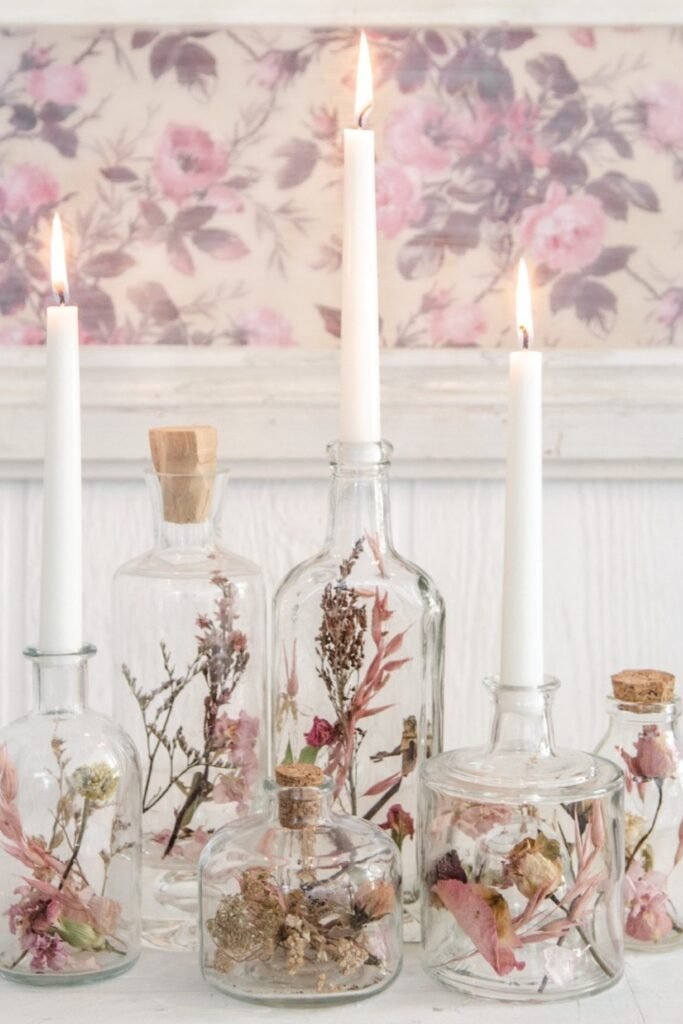 Clear bottles filled with dried flowers make elegant decorative holders for candles, ideal for mantels, coffee tables, or romantic evening setups.