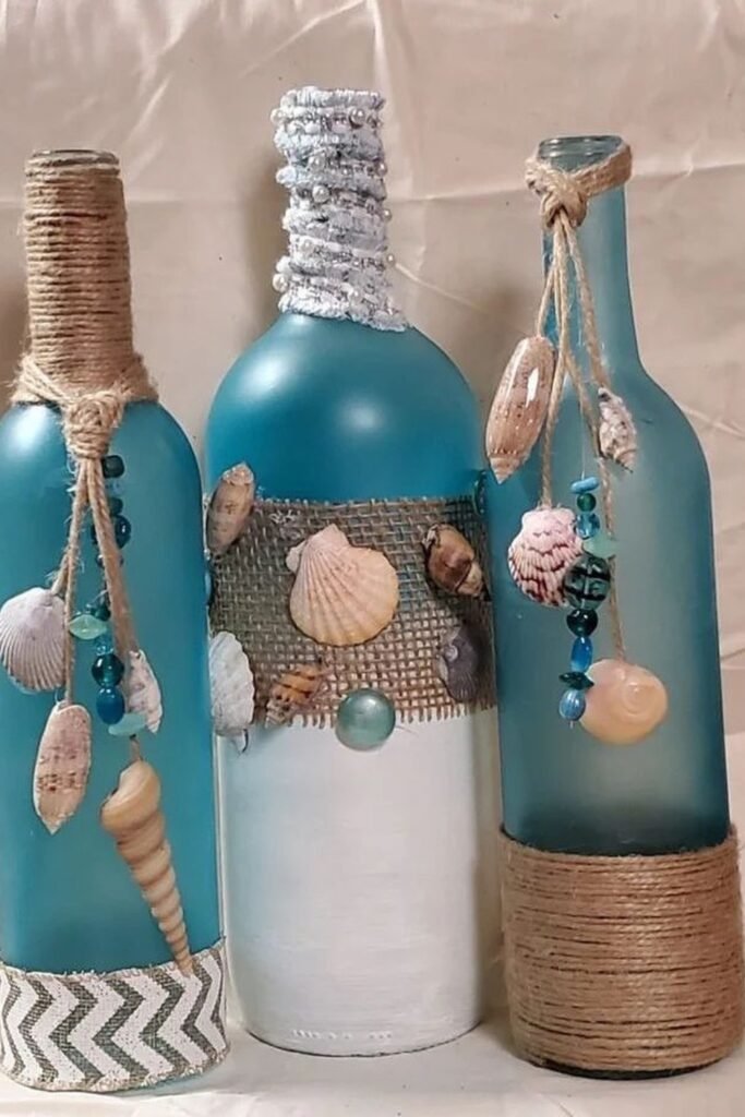 Frosted blue bottles paired with shells create coastal décor perfect for beach-themed shelves, airy entry corners, or breezy living room displays needing texture.
