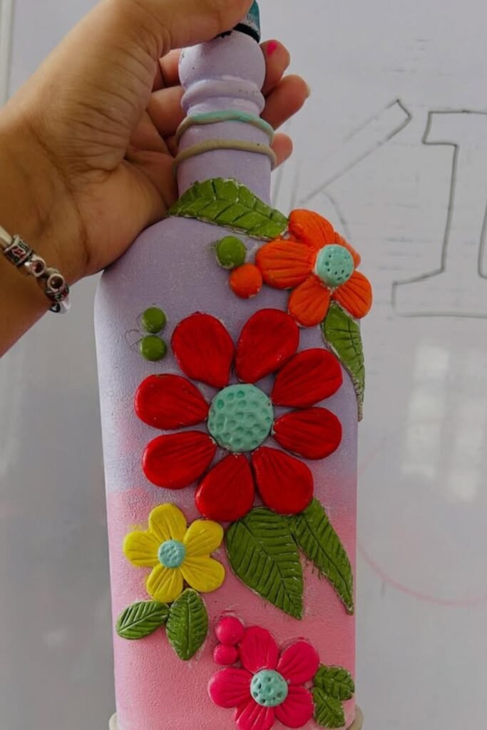 Bold clay flowers transform a plain bottle into vibrant décor suited for craft rooms, study corners, or bright shelves needing lively handmade texture.