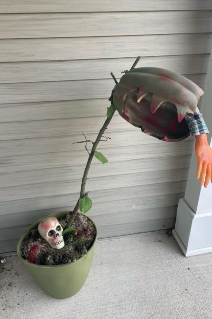 Attach the head to a wooden stick or a PVC pipe, and add fake leaves to make it look like a stem. Place moss and a skull at the base for an extra spooky touch.