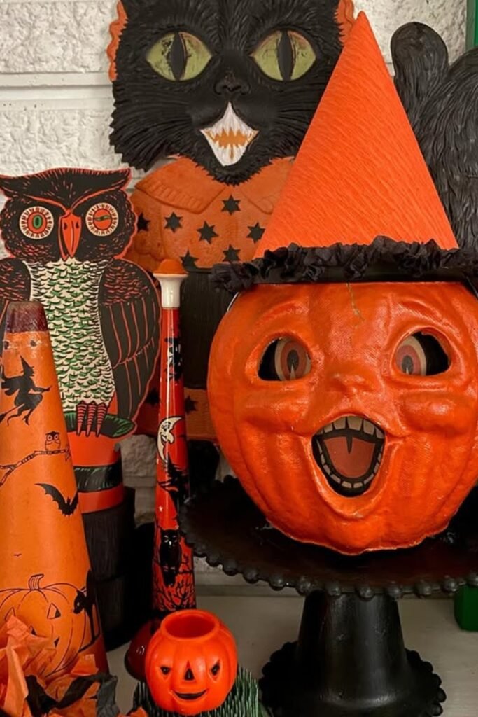 Want to add some nostalgic charm to your Halloween setup? Mix in vintage-style pieces like classic owls, black cats, and cheerful jack-o’-lanterns.
