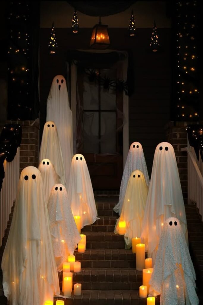 This works best when you have a porch or entrance with stairs your guests will feel like they are walking right into a gathering of ghosts.