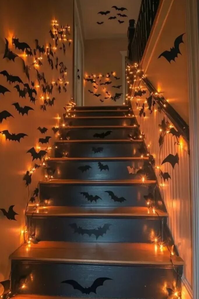 Use painter’s tape to stick them on the wall so you can remove them easily later. String orange lights along the handrail and stair edges to make the bats pop in the darkness.