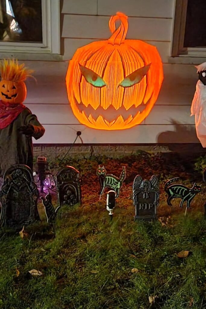 Turn your front yard into a small haunted graveyard using a mix of tombstones, figures, and a bright backdrop.