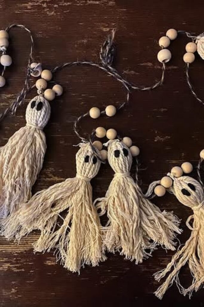 Add a handmade touch with a garland of tiny ghosts made from yarn or twine. Wrap the strands to create tassels, tie off the tops, and draw small black eyes to make them come alive.