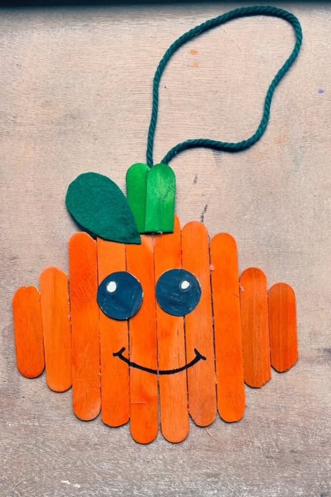 Line up orange-painted popsicle sticks, glue them together side by side, and attach a green stem with a felt leaf at the top.