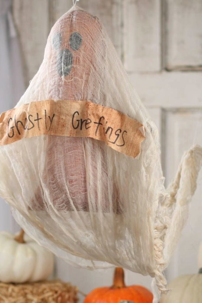 To create a matching ghost, drape some cheesecloth over a small balloon or foam ball. Spray the cloth with starch to hold its shape.