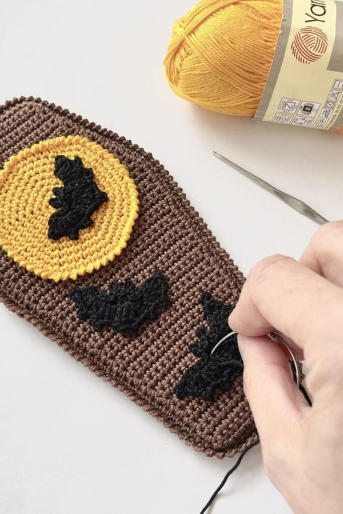 For a handmade touch, crochet a simple patch shaped like a coffin or rectangle and add Halloween designs like bats or moons.