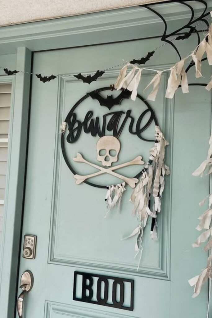 Start with a bold door sign like a skull and crossbones inside a metal hoop and add lightweight banners such as bats or paper streamers to frame the space.