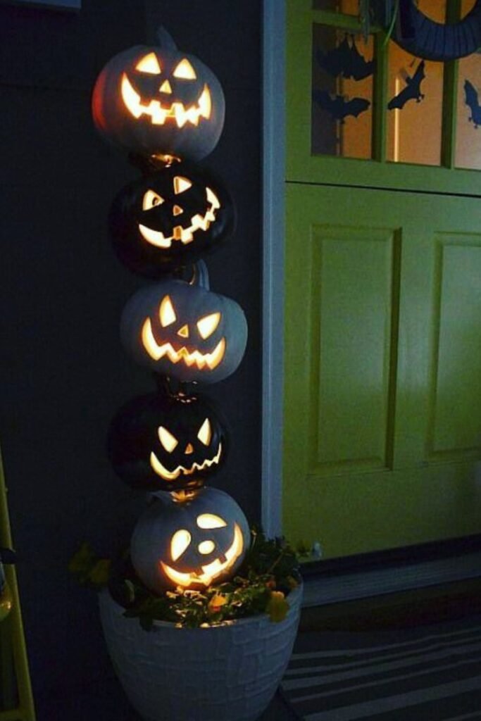 This setup works best near the front door or on the porch, where the height grabs attention. It is easy to reuse them; just store the pumpkins flat once Halloween is over.