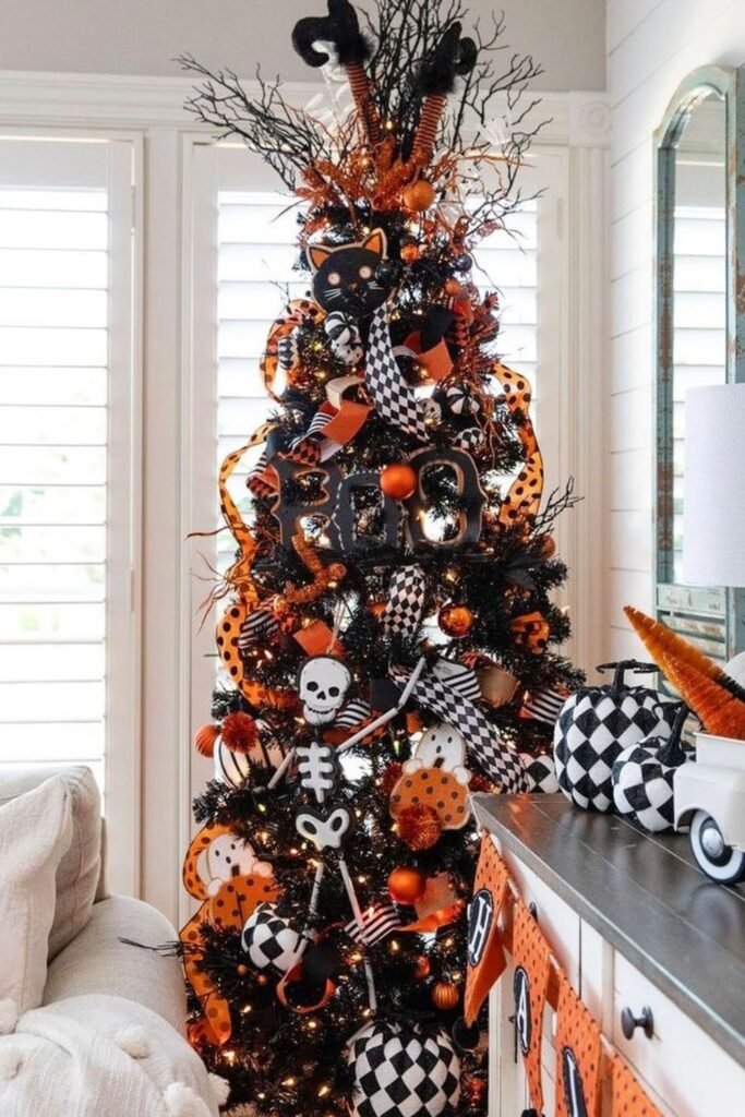 Replace the Christmas ornaments with orange and black decorations like ribbons, skeleton cutouts, and decorated pumpkins.