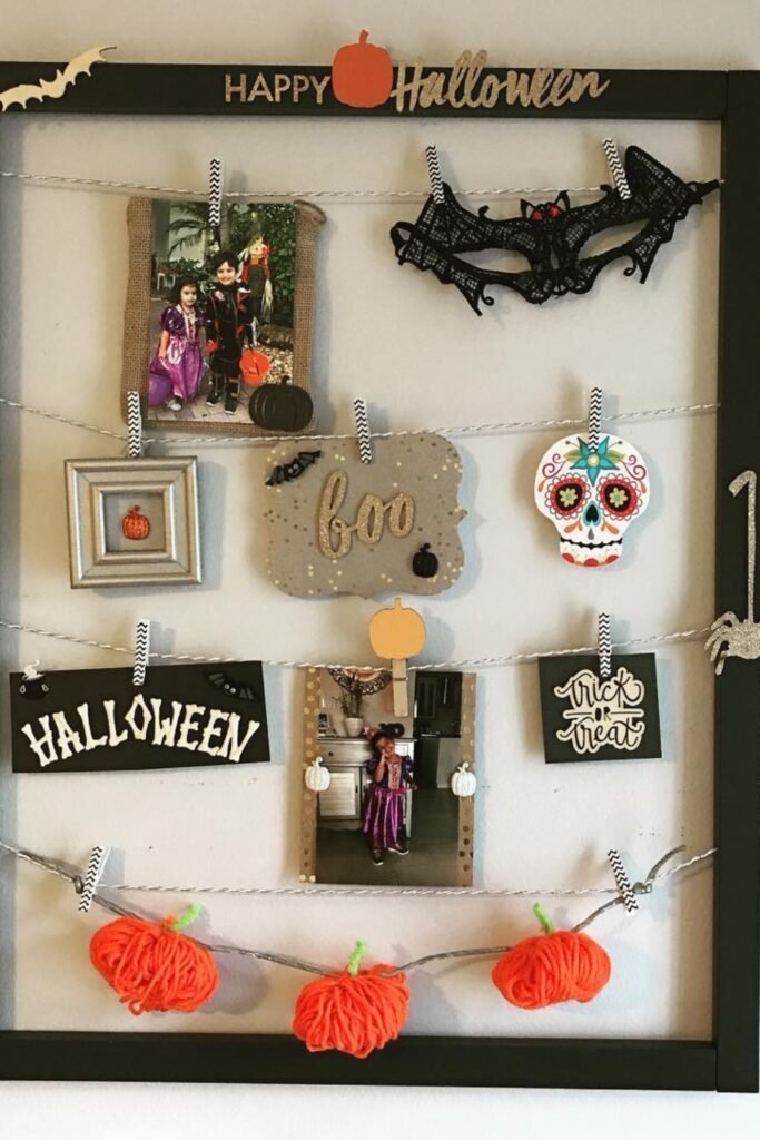 String twine or yarn across the frame and clip on photos, Halloween cards, or small paper cutouts with mini clothespins.