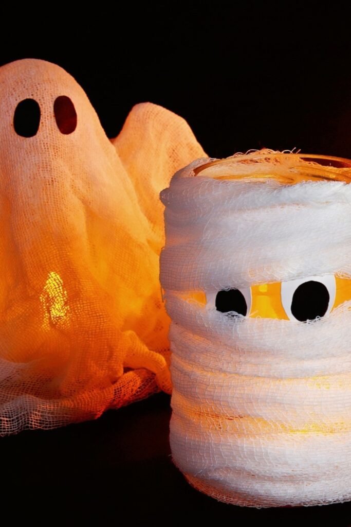 For a fast and spooky table decoration, you can make a glowing mummy. Just wrap a mason jar with medical gauze.