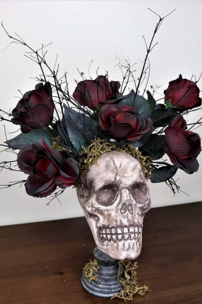 Cut a hole in the top, place floral foam inside, and arrange dark fake roses or branches to create a gothic look.