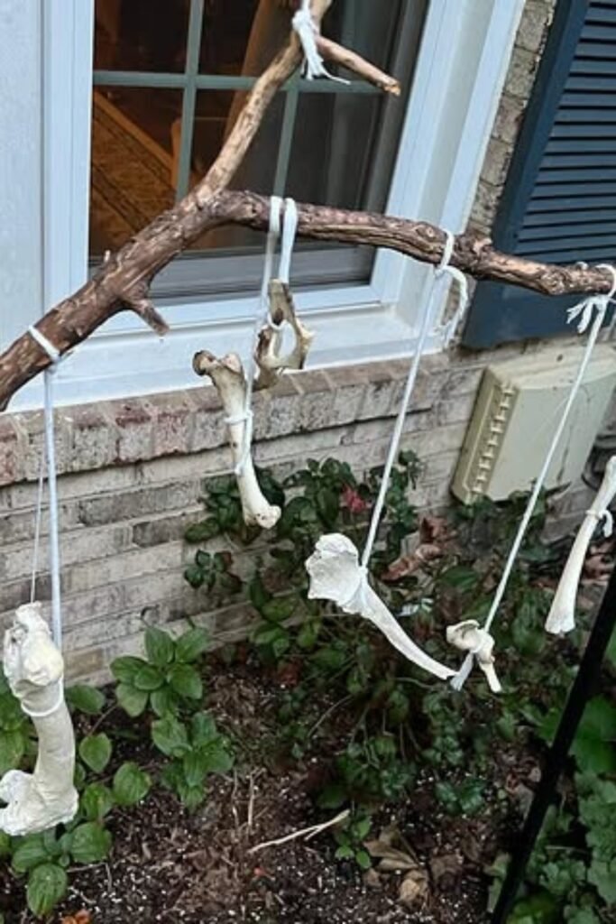 For an outdoor decoration that moves with the wind, tie lightweight plastic bones to a sturdy tree branch using twine or rope.
