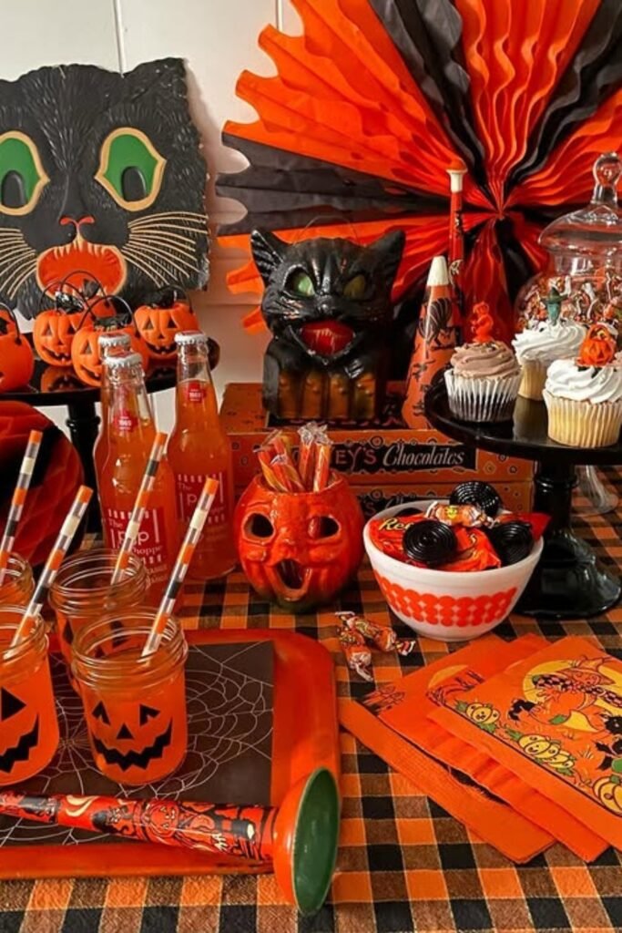 Start with a checkered tablecloth as the base. Add paper cats, jack-o’-lantern bowls, and black-and-orange accents to set the mood.