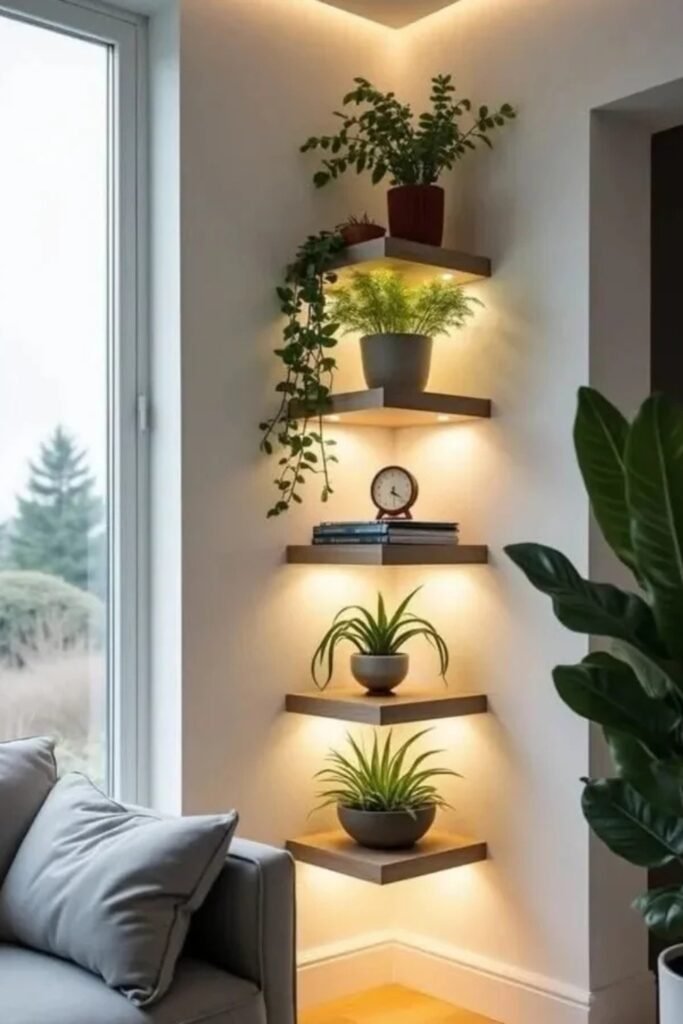 Stacked corner shelves allow small plants to form structured height where empty walls appear unnoticed and underused within open spaces.