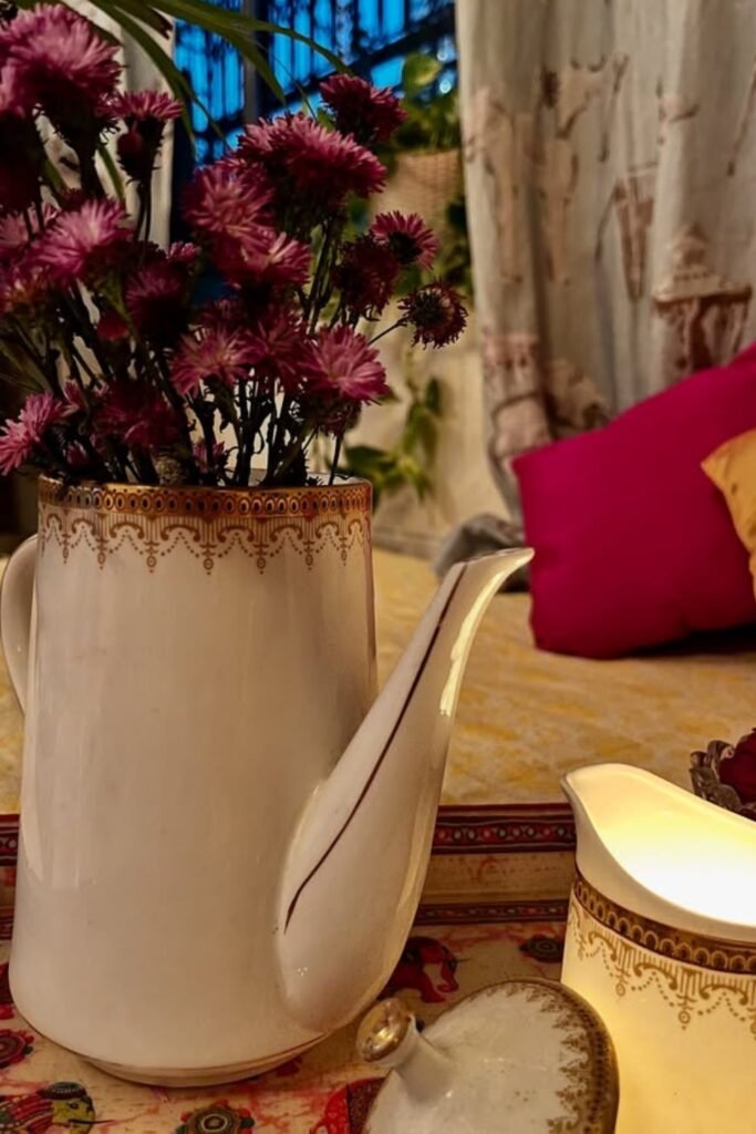A vintage teapot adds warm charm to bedside corners that require gentle character while retaining an intimate atmosphere during quiet evening routines.