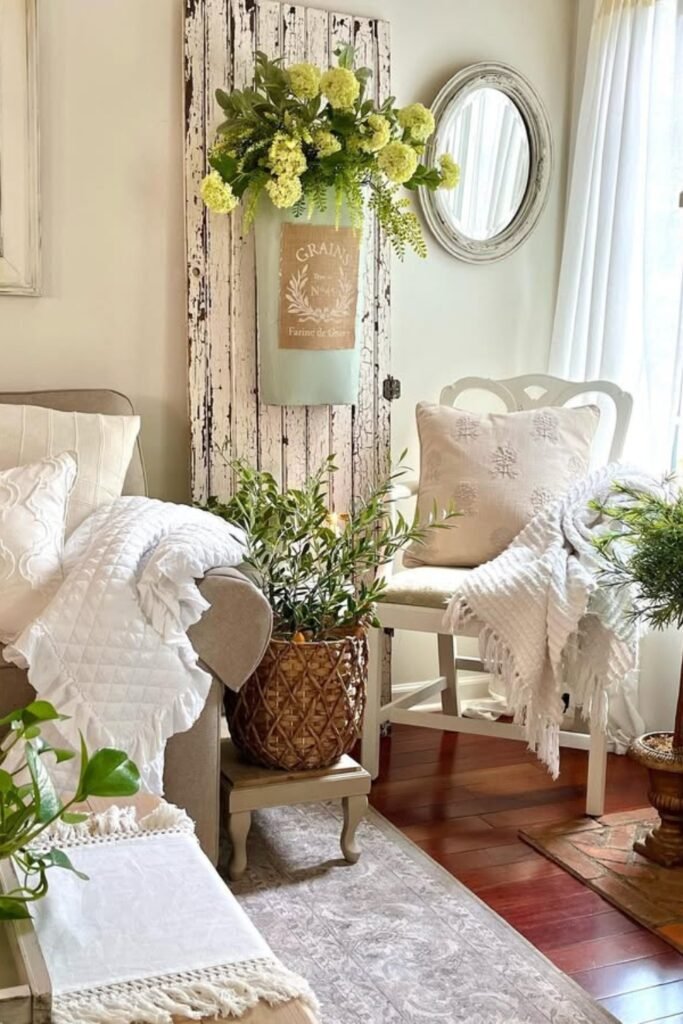 Its distressed background pairs beautifully with neutral furniture, helping soft greenery introduce freshness while maintaining the home’s gentle cohesive charm effortlessly.
