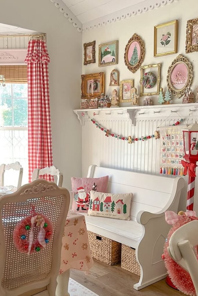 Using soft holiday colors across the shelf helps your room feel festive instantly, especially when you repeat gentle pinks around small décor pieces.